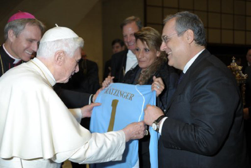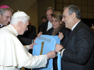 Au terme de l'Audience générale, il a pu converser quelques instants avec le Pape, et lui remettre le maillot n°1 de l'équipe, avec l'inscription "Ratzinger"