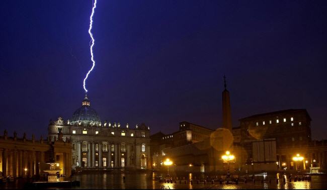 La nouvelle de la démission du Saint-Père (je sais que le mot n'est pas approprié, mais tout le monde comprend) a été vraiment comme un coup de tonnerre, mais pas dans un ciel serein. Un coup de tonnerre, un vrai, il y en a d'ailleurs eu un, hier, au-dessus de la Basilique Saint-Pierre. Mais on sait que ce Pontificat extraordinaire a été marqué de signes extraordinaires: on se souvient tout particulièrement de l'arc-en ciel d'Auschwitz, mais il y en a eu d'autres..