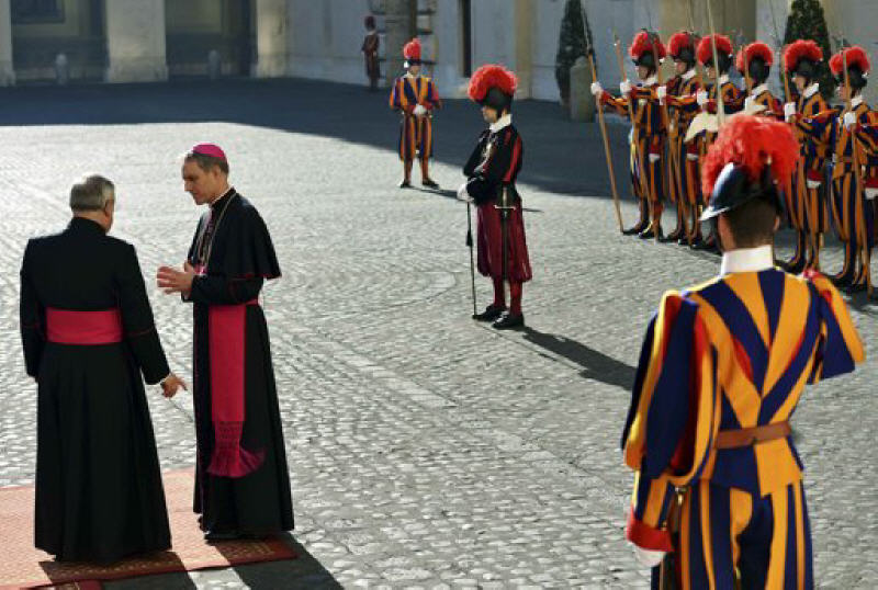 Mgr Gänswein a accueilli les souverains dans la cour de Saint-Damase et leur a présenté les dignitaires présents (les gentilhommes de la Maison pontificale.)