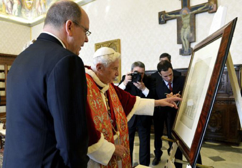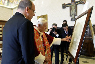 A l'échange des cadeaux, Benoît XVI a reçu un livre et un cadre dédié à leur ancêtre, le cardinal Jérôme Grimaldi, qui a vécu dans les XVIe et XVIIe siècles, et a offert une sanguine représentant un projet jamais réalisé de la basilique Saint-Pierre. Les princes et le Pape ont finalement renouvelé les vœux de bonne année.