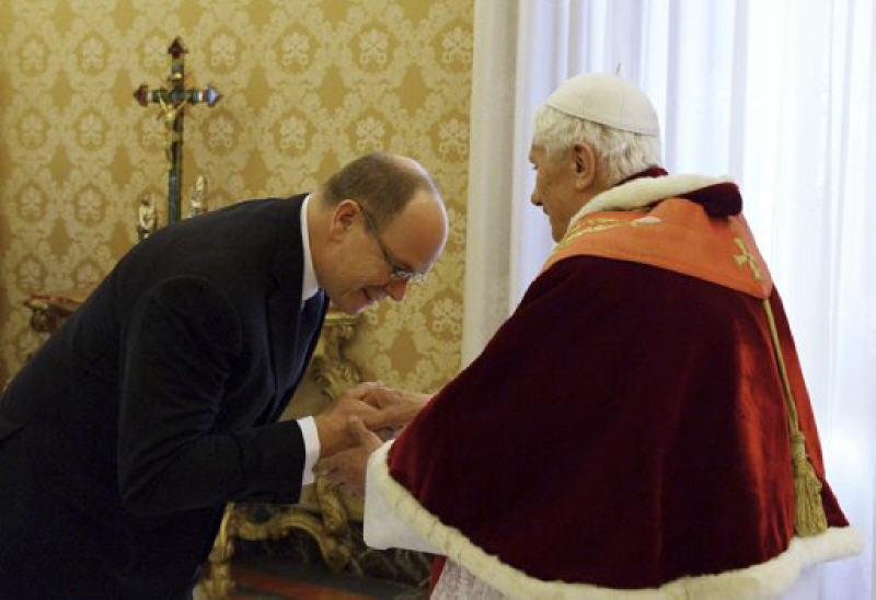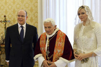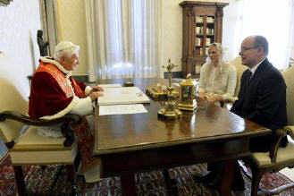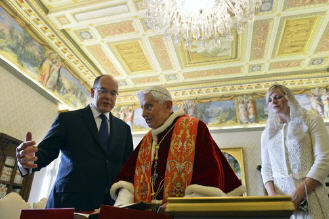 La première fois pour Albert de Monaco et Charlene (en tailleur blanc avec un voile sur la tête), reçus au Vatican par le pape Benoît XVI, 55 ans après la visite historique au pape Jean XXIII de Grâce et Rainier, a également marqué les débuts dans le rôle de nouveau préfet de la Maison pontificale, de Mgr Georg Gaenswein, fraîchement ordonné évêque.