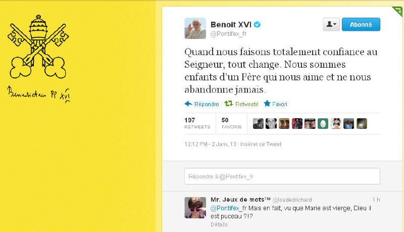 Par moment j'ai envie de dire à notre Pape: "de grâce, arrêtez les tweets! Ne donnez pas une tribune à Satan! Il a assez l'occasion de parler à travers les médias!" Monique T.