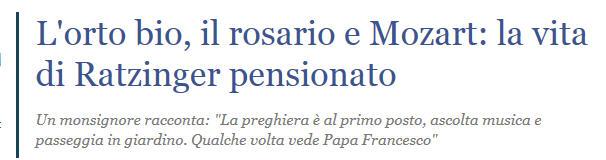 Suit une enfilade de banalités que n'importe qui aurait pu écrire sans avoir jamais rencontré le Saint-Père Benoît: lever à 7 heures, messe puis petit déjeuner (on s'en douterait!) longues promenades dans les jardins, avec les 4 memores et l'inévitable "fidèle" secrétaire, Mozart, Bach, la visite de quelques amis, beaucoup de prière, et de temps en temps un saut dans le potager pour récolter des fruits et des légumes (selon notre monsignore, un potager qu'il avait confié aux soins des religieuses pour avoir toujours à sa disposition des fruits et légumes exclusivement biologiques... "pape vert" oblige, bien sûr!!!)