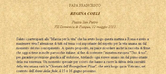 Je salue les participants à la «Marche pour la vie» qui a eu lieu à Rome, ce matin, et vous invite à garder vive l'attention de tous sur la question si importante du respect de la vie humaine depuis le moment de sa conception. À cet égard, je suis heureux de rappeler la collecte des signatures qui a lieu actuellement dans de nombreuses paroisses italiennes, afin de soutenir l'initiative européenne «Uno di noi» (ndt: Les évêques européens du CCEE chez le Pape) pour garantir la protection juridique de l'embryon, protégeant chaque être humain dès le premier moment de son existence. Un moment spécial pour ceux qui ont à coeur la défense du caractère sacré de la vie humaine sera la «Journée de l'Evangelium Vitae », qui aura lieu ici, au Vatican, dans le cadre de l'Année de la Foi , les 15 et 16 Juin prochains.