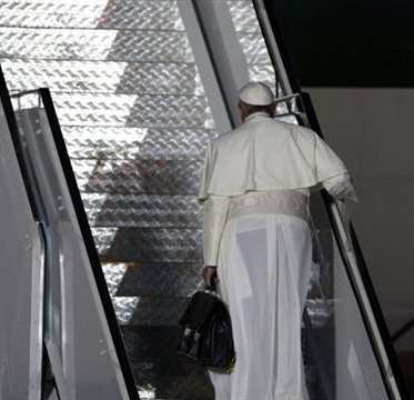 (rires)«Ce n'était pas le code de la bombe atomique! Je l'ai pris parce que je l'ai toujours fait, quand je voyage je porte mon sac ... et ce qu'il y a dedans? Il y a mon rasoir, il y a le bréviaire, il y a le programme du jour, il y a un livre à lire, j'en ai apporté un de sainte Thérèse dont je suis dévot. Je suis toujours allé avec mon sac de voyage, c'est normal, mais nous devons être normaux. C'est un peu étrange pour moi ce que tu me dis, que la photo a fait le tour du monde. Eh bien, nous devons nous habituer à être normaux, à la normalité de la vie ».