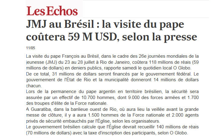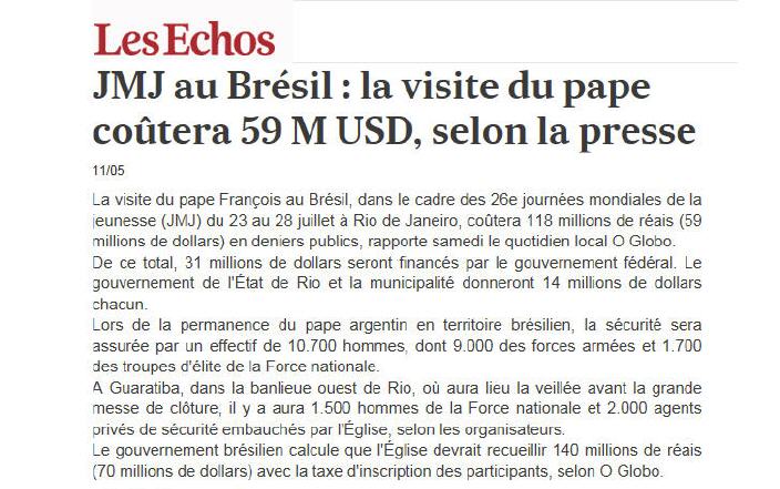 "Ils" ne changeront jamais!! Ils ne s'attaquent pas directement au Pape, qui bénéficie encore de l'étrange 'pax mediatica', mais plus fielleusement, au coût présumé des prochaines JMJ. Bref, la seule chose qui les intéresse, c'est le fric (12/5/2013)