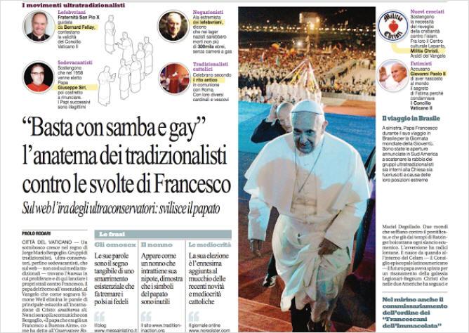 Dans un article paru hier sous sa plume, il dénonce en termes assez violents quelques blogs de sensibilité "traditionalistes", mais qui ont toujours été, en communion avec Rome - les italiens Messa in latino, et Corrispondenza Romana, l'américain National Catholic Register - "coupables" de critiquer les propos du Pape (qui, dit Rodari, a "supprimé l'excommunication!) sur les gays, la présumée "désacralisation des symboles", l'affaire des franciscains de l'Immaculée, les fantaisies liturgiques en particulier lors des JMJ... Le tout, je le précise, dans les limites du respect, et de la critique constructive (ce qui n'était pas le cas du temps de Benoît XVI)