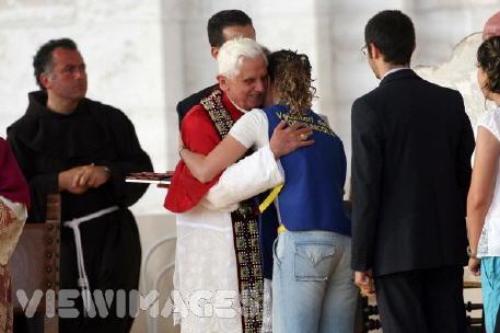 Chers jeunes, vous m'avez rappelé certains problèmes de la condition de jeunes, de votre difficulté à vous construire un avenir, et surtout, des difficultés à discerner la vérité. Dans le récit de la passion du Christ, nous trouvons la question de Ponce Pilate: "Qu'est-ce que la vérité?"). C'est la question d'un sceptique qui dit: "Mais toi, tu dis être la vérité, mais qu'est-ce que la vérité?" Et ainsi, la vérité ne pouvant être reconnue, Pilate laisse entendre: faisons ce qui est le plus pratique, ce qui a le plus de succès sans chercher la vérité. Puis, il condamne Jésus à mort, car il suit le pragmatisme, le succès, son propre bonheur. Aujourd'hui aussi, de nombreuses personnes disent: "Mais qu'est-ce que la vérité? Nous pouvons en trouver des fragments, mais comment pourrions-nous trouver la vérité?". Il est réellement difficile de penser que cela est la vérité: Jésus Christ, la vraie Vie, la boussole de notre vie. Et toutefois, si nous commençons, comme nous en serions tentés, à vivre uniquement en fonction des possibilités du moment, sans vérité, nous perdons véritablement le critère et nous perdons également le fondement de la paix commune qui ne peut être que la vérité. Et cette vérité est le Christ. La vérité du Christ s'est vérifiée dans la vie des saints de tous les siècles. Les saints sont la grande trace de lumière dans l'histoire qui témoigne: voilà la vie, voilà le chemin, voilà la vérité. C'est pourquoi nous avons le courage de dire "oui" à Jésus Christ: "Ta vérité s'est vérifiée dans la vie de tous les saints! Nous te suivons!".