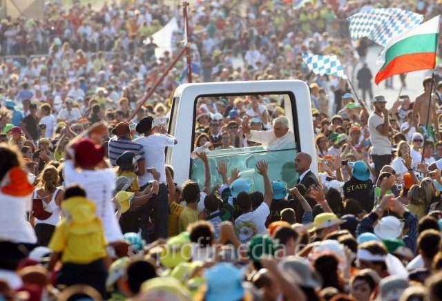 Et ainsi, nous aussi, nous devons former des centres de foi, d'espérance, d'amour et de solidarité, de sens de la justice et de la légalité, de coopération. C'est uniquement ainsi que peut survivre la société moderne. Elle a besoin de ce courage, de créer des centres, même si à l'évidence, il ne semble pas y avoir d'espérance. Nous devons nous opposer à ce désespoir, nous devons collaborer avec une grande solidarité et faire ce qui nous est possible pour que grandisse l'espérance, pour que les hommes puissent collaborer et vivre. Le monde, nous le voyons, doit être changé, mais c'est précisément la mission de la jeunesse que de le changer! Nous ne pouvons pas le faire seulement avec nos forces, mais en communion de foi et de chemin. En communion avec Marie, avec tous les saints, en communion avec le Christ, nous pouvons faire quelque chose d'essentiel et je vous encourage et je vous invite à avoir confiance dans le Christ, à avoir confiance en Dieu. Etre dans la grande compagnie des saints et aller de l'avant avec eux peut changer le monde, en créant des centres dans la périphérie, pour qu'elle devienne réellement visible et que l'espérance de tous devienne réaliste et que chacun puisse dire: "Je suis important dans l'ensemble de l'Histoire. Le Seigneur nous aidera".