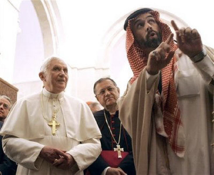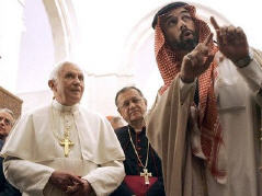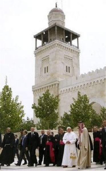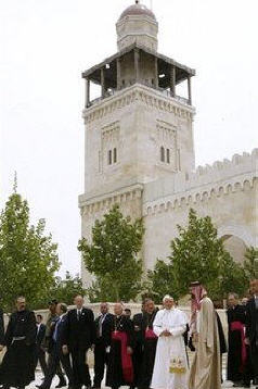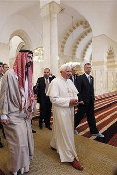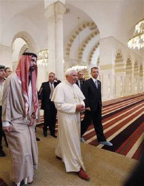 Aux côtés du Saint-Père, le Prince Ghazi Bin Talal, signataire du message du 13 octobre 2007 adressé par "138 sages musulmans au Pape et aux responsables des autres Eglises et confessions chrétiennes". On notera que par un geste de délicatesse, et grâce à un aménagement approprié (un plancher amovible), le Prince a fait en sorte que le Pape n'ait pas besoin de se déchausser pour pénétrer dans la mosquée.