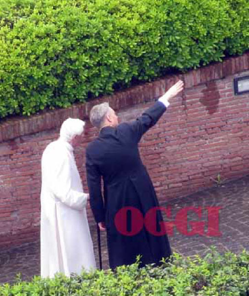 "Oggi", du 29-06-2013: promenade avec son secrétaire dans le jardin du Monastère (benoit-et-moi.fr/2013-II/benoit/des-photos-en-rafale).