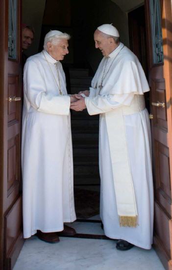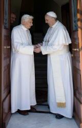 Benoît XVI vient l'attendre à l'héliport, silhouette fragile, encore très fatigué mais l'accolade est chaleureuse de la part de notre Benoît. Le geste de sa main dans la chapelle pour mener François à la place qu'il doit occuper en vertu du protocole est surprenant par sa vivacité, sa force pour montrer sa volonté de rester à l'écart comme il l'a promis le 28 février.