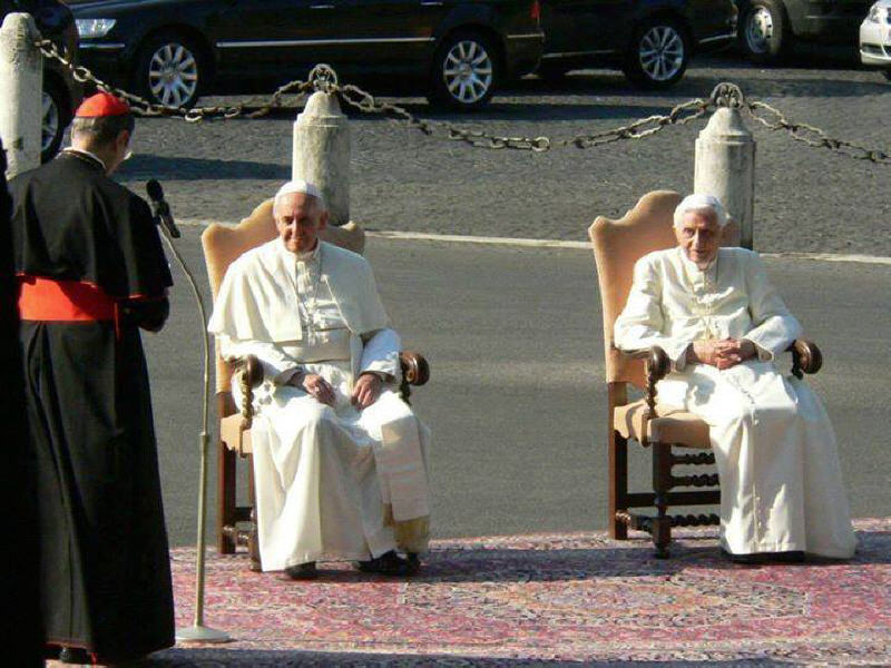 "Chi" permet de retrouver en date du 11 mai 2013 des photos de magazine avec François et Benoît mais surtout une image très simple de famille réunie à l'ombre, à l'extérieur : Benoît, Georg Gänswein et les quatre memores, tout ce qu'il aime (benoit-et-moi.fr/2013-II/articles/le-reportage-de-chi)