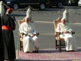 Puis François arrive, l'accolade est chaleureuse, longue; la rencontre est heureuse et ils se dirigent vers leurs places respectives, côte à côte et identiques, Benoît à gauche de François. Il fait un temps magnifique, un ciel d'un bleu intense, un cadre de verdure, une cérémonie simple et le pape émérite suit attentivement. François n'omettra pas de rappeler que cette statue est due à Benoît XVI (je simplifie car je n'ai pas les termes exacts) et pendant qu'il parle Benoît applaudit.
