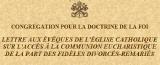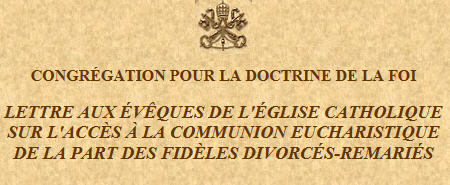 Le document signé par le préfet de la Congrégation pour la Doctrine de la Foi, Joseph Ratzinger, et adressé à tous les évêques du monde «au sujet de la réception de la Sainte Communion par les fidèles divorcés et remariés» date du 14 Septembre 1994, Fête de l'Exaltation de la Sainte Croix.