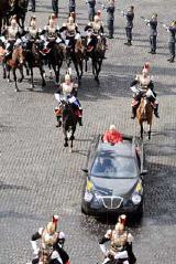 Pas de cortège avec les cuirassiers à cheval, pas de longue procession de grosses voitures de la suite papale pour cette visite. François est arrivé dans le palais qui pendant trois siècles, fut la résidence des Papes, à bord de sa Ford Focus bleu métallique, sans que le trafic du centre de la capitale ait été bloqué. Bergoglio est apparu très concentré, et peut-être un peu mal à l'aise devant les honneurs militaires, malgré le cérémonial marquée par une sobriété qu'on n'avait jamais vue auparavant.