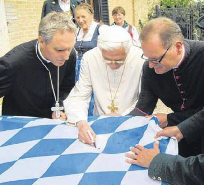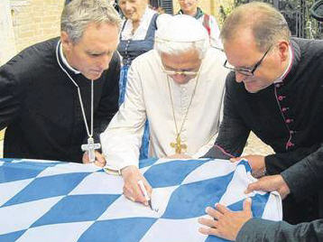 >| du 11 au 14 octobre des photos prises lors de la visite d'un groupe de Ratisbonne au Monastère. Sur la première, exercice périlleux nécessitant la présence de trois hommes pour tendre le drapeau sur lequel Benoît XVI va signer, bien sûr c'est la drapeau à damiers bleus et blancs. On ressent une grande proximité, tout y concourt : la langue, le même pays, les souvenirs, la Bavière qui est un trait d'union puissant et indélébile. Une grande photo de groupe avec des visiteurs simples, des sourires généreux, sincères, de la joie vraie. Une photo que j'aime beaucoup : sur le pas de la porte Benoît, prêt à rentrer, dit au revoir de la main, visage souriant