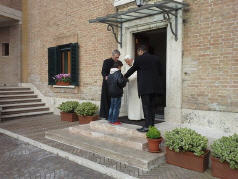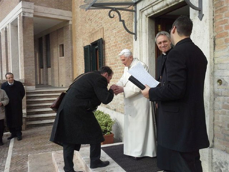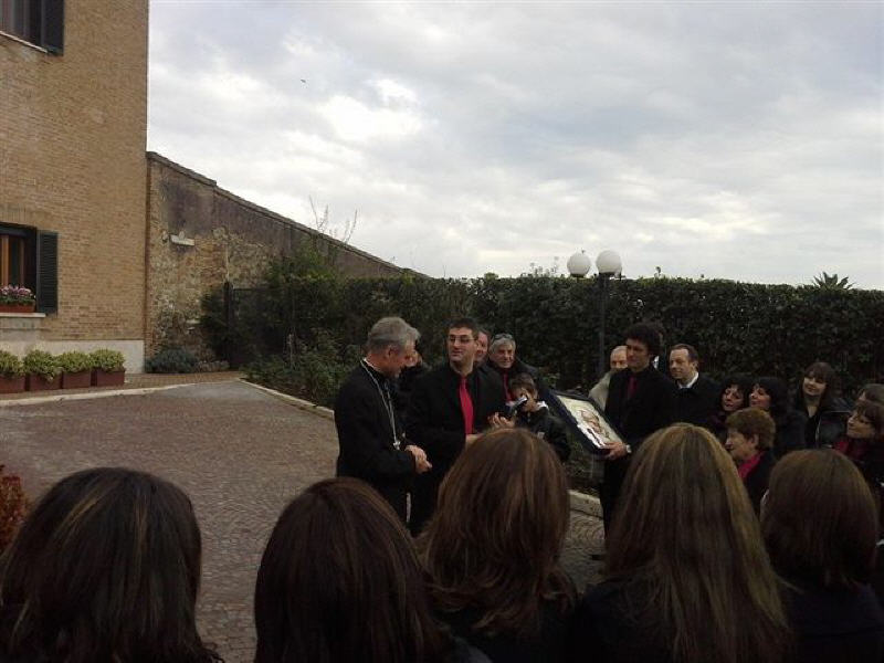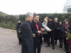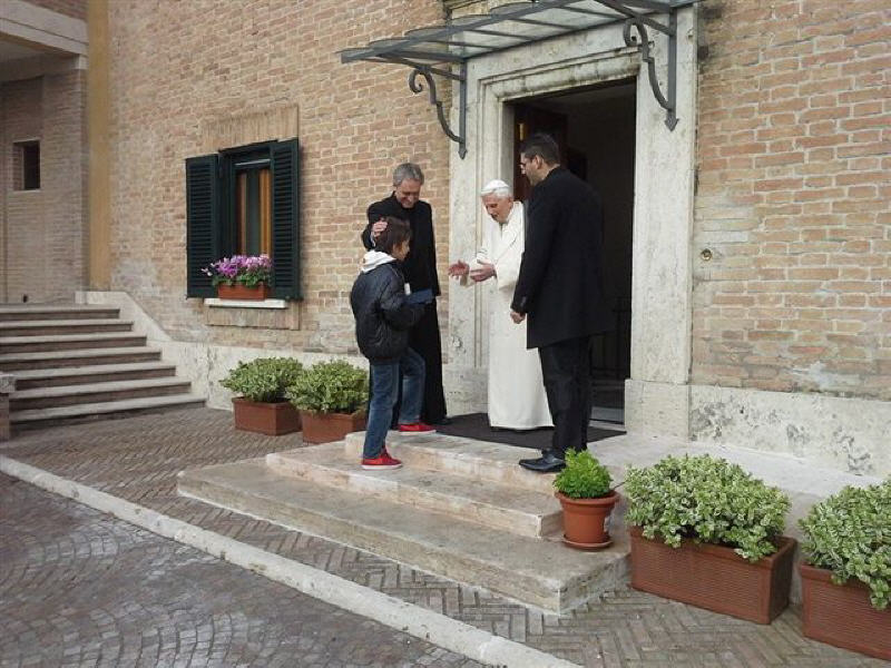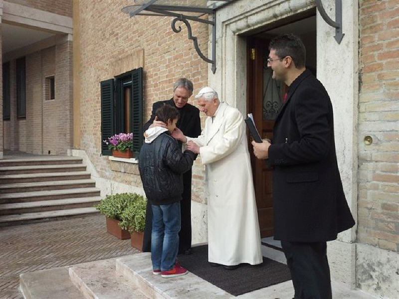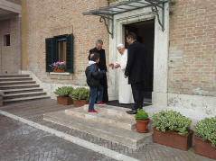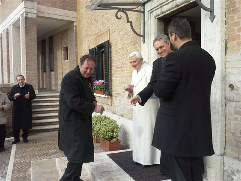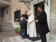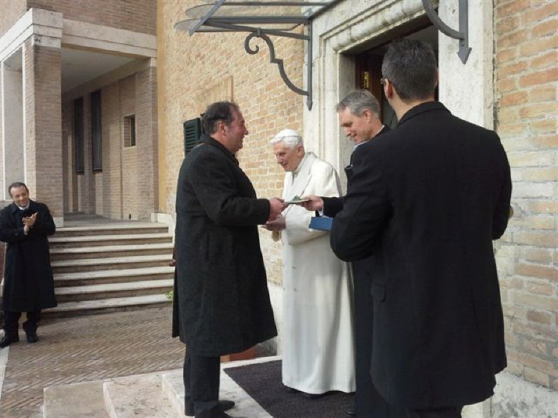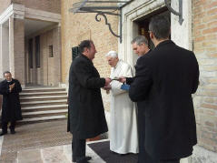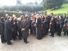 La rencontre, qui a eu lieu près du monastère Mater Ecclesiae a été touchante, le Choeur a remercié le Pontife pour la visite faite dans notre ville le 28 avril 2009, 22 jours après le séisme du 6 avril; il a rappelé le geste touchant fait par le Pontife: à peine ouverte la Porte Sainte de Collemaggio, avec à l'intérieur la châsse contenant la dépouille mortelle de Célestin, le Pape, ému, donna à Célestin, mais aussi à la cité de l'Aquilà, son pallium.