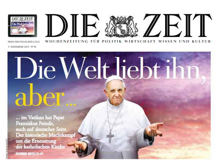 Le dernier numéro de Die Zeit titre «Die Welt liebt inhn» (le monde l'aime) et consacre un dossier imposant de trois pleines pages au Pape régnant (die-zeit.pdf [483 KB]