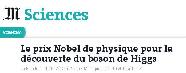 A propos du prix Nobel de physique attribué aux découvreurs du "boson de Higgs" (9/10/2013)