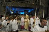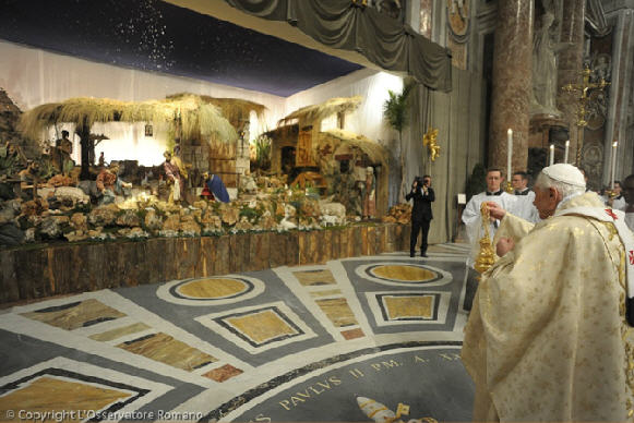 Celui qui aujourd’hui veut entrer dans l’église de la Nativité de Jésus à Bethléem découvre que le portail, qui un temps était haut de cinq mètres et demi et à travers lequel les empereurs et les califes entraient dans l’édifice, a été en grande partie muré. Est demeurée seulement une ouverture basse d’un mètre et demi. L’intention était probablement de mieux protéger l’église contre d’éventuels assauts, mais surtout d’éviter qu’on entre à cheval dans la maison de Dieu. Celui qui désire entrer dans le lieu de la naissance de Jésus, doit se baisser. Il me semble qu’en cela se manifeste une vérité plus profonde, par laquelle nous voulons nous laisser toucher en cette sainte Nuit : si nous voulons trouver le Dieu apparu comme un enfant, alors nous devons descendre du cheval de notre raison « libérale ». Nous devons déposer nos fausses certitudes, notre orgueil intellectuel, qui nous empêche de percevoir la proximité de Dieu. Nous devons suivre le chemin intérieur de saint François – le chemin vers cette extrême simplicité extérieure et intérieure qui rend le cœur capable de voir. Nous devons nous baisser, aller spirituellement, pour ainsi dire, à pied, pour pouvoir entrer à travers le portail de la foi et rencontrer le Dieu qui est différent de nos préjugés et de nos opinions : le Dieu qui se cache dans l’humilité d’un enfant qui vient de naître. Célébrons ainsi la liturgie de cette sainte Nuit et renonçons à nous fixer sur ce qui est matériel, mesurable et touchable. Laissons-nous simplifier par ce Dieu qui se manifeste au cœur devenu simple. Et prions en ce moment avant tout pour que tous ceux qui doivent vivre Noël dans la pauvreté, dans la souffrance, dans la condition de migrants, afin que leur apparaisse un rayon de la bonté de Dieu ; afin que les touche, ainsi que nous, cette bonté que Dieu, par la naissance de son Fils dans l’étable, a voulu porter dans le monde.