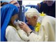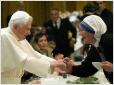 La bienheureuse Teresa de Calcutta a vécu la charité envers tous, sans distinction, mais avec une prédilection pour les pauvres et les abandonnés: un signe lumineux de la paternité et de la bonté de Dieu. Elle a su reconnaître en chacun de nous le visage du Christ, aimé par elle de tout son être: le Christ, qu'elle adorait, et recevait dans l'Eucharistie, elle continuait de le rencontrer dans les routes et les rues de la ville, devenant «image» vivante de Jésus qui versait sur les plaies de l'homme la grâce de l'amour miséricordieux. A ceux qui se demandent pourquoi Mère Teresa est devenue si célèbre, la réponse est simple: parce qu'elle a vécu de manière humble et cachée, pour l'amour et dans l'amour de Dieu. Elle-même affirmait que sa plus grande récompense était d'aimer Jésus et de le servir dans les pauvres. Sa petite silhouette, les mains jointes, ou caressant un malade, un lépreux, un mourant, un enfant, est le signe visible d'une vie transformée par Dieu. Dans la nuit de la douleur humaine, elle a fait resplendir la lumière de l'Amour Divin et a aidé beaucoup de cœurs à trouver cette paix que Dieu seul peut donner.