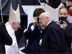 François l'a salué deux fois, au début et à la fin, mais il n'a pas mentionné son nom lors des remerciements. Il y a eu un très beau plan de Benoît, très recueilli après la communion. De rares personnalités ont eu l'idée d'aller le saluer. J'ai vu un Monsieur et une Dame: le président Napolitano, peut-être? (ndlr: en effet)