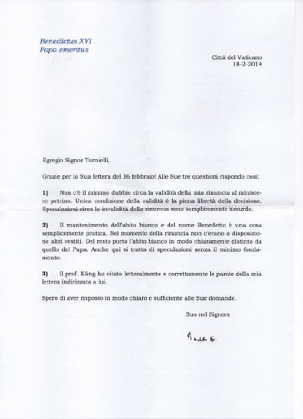 Deux jours après la réponse de Ratzinger est arrivé, sur papier à lettre à l'en-tête "Benedictus XVI. Papa emeritus", sans armoiries (Ratzinger n'a pas voulu d'armoiries spéciales, mais il n'utilise pas celles pontificales, au moins sur le papier à lettre).