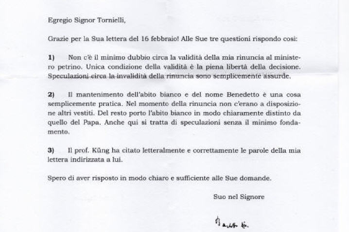 Sur son blog personnel Sacri Palazzi, Tornielli avait publié hier (27 février) le texte de la très brève lettre du Pape émérite. On peut constater que le texte a été dactylographié et que Benoît XVI a vraiment fait le strict minimum. Il n'y a rien de plus que ce qui a été cité dans l'article de La Stampa ("Ratzinger" répond à Tornielli )