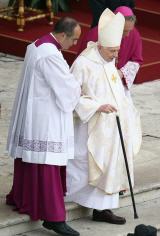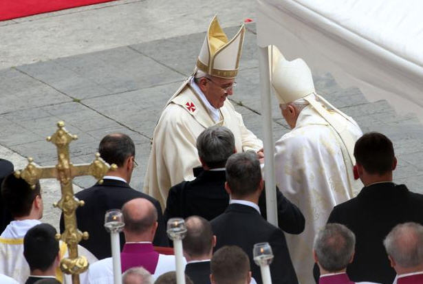 Cette fois, la cérémonie ayant lieu place Saint-Pierre, Benoît XVI a été visible dès son arrivée fort discrète entre Mgr Gänswein et un cérémoniaire qui sera à gauche de François pendant la célébration.