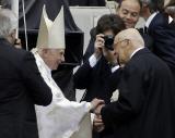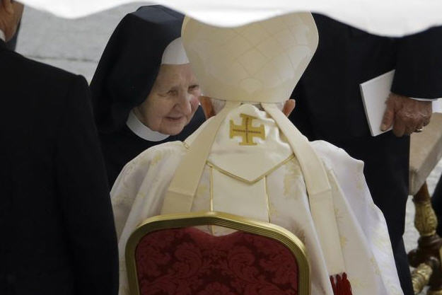 Sœur Tobiana salue Benoît XVI avec chaleur et embrasse ses mains qu'elle garde longuement enfermées dans les siennes. C'est un joli moment émouvant et le visage de Benoît est heureux.
