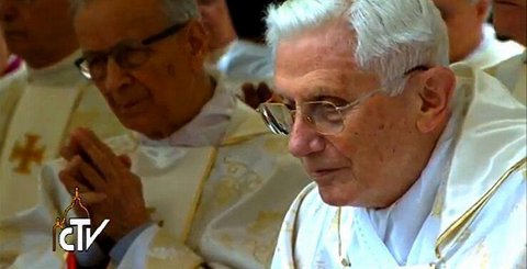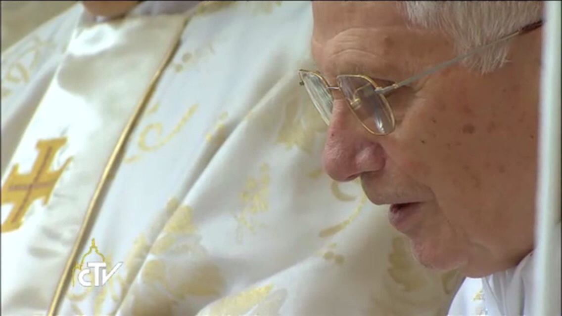 Pendant le Gloria, Benoît chante et suit sur son livret. Pour le psaume je retrouve le diacre au visage connu depuis longtemps, j'aime bien sa voix. L'évangile est lu en latin et en grec, classique. Benoît XVI est attentif, concentré, visage calme Par contre, à la fin de l'homélie, brève comme d'habitude, le visage de Benoît paraît concentré ou fatigué ou pensif, je ne sais. Autre passage sur Benoît : debout mais incliné il relève la tête. Avant la prière universelle il suit, debout, et chante. Pendant la consécration il est debout avec les autres cardinaux. Au moment du signe de paix le cardinal Bertone et d'autres viennent l'échanger avec le pape émérite. Il communie sous les deux espèces. Pendant le temps de silence après la communion il médite sans regarder autour de lui, très pris par la prière. Le petit livret remis est un fidèle compagnon pour lui.