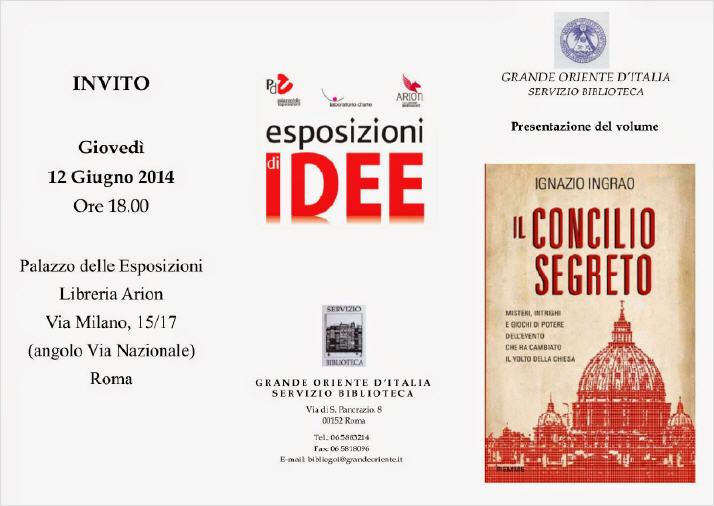 Le Service Bibliothèque du Grand Orient d'Italie organise le 12 Juin à 18h00 (...) un débat sur «L'Église du dialogue, du Concile Vatican II au pape François». L'occasion est la sortie du livre "Le Concile secret" du journaliste vaticaniste Ignazio Ingrao. Avec l'auteur, interviendront l'historien Alberto Melloni (catholique de gauche), la théologienne Marinella Perroni (défenseur convaincue de la théorie du gender) et le Grand Maître Stephen Bisi. Le modérateur de la rencontre sera le journaliste Marco Politi (cf. Les loups de François... ).