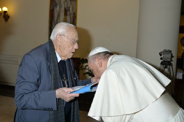 Don Michele de Paolis, 93 ans, n’en revient pas, comme n’en reviennent pas tous ceux qui étaient présents à la rencontre du pape François avec son auditoire après la messe du matin à Sainte-Marthe, le 6 mai dernier : le Souverain pontife a pris son bras et baisé sa main dans un geste d’humilité extrême que seul un grand homme fait à un autre grand homme de son rang.