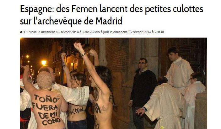 Hier, le cardinal archevêque de Madrid, Mgr Rouco Varela a été agressé par un groupe de femen dépoitraillées à l'entrée d'une église. Le gouvernement espagnol se laissera-t-il impressionner par ce déferlement haineux qui se manifeste un peu partout en Europe occidentale, pimenté de slogans violemment antichrétiens comme ici, à Nantes? Inutile de souligner que ces manifestations bénéficient de la caisse de résonnance d'une presse largement acquise à ces revendications féministes...