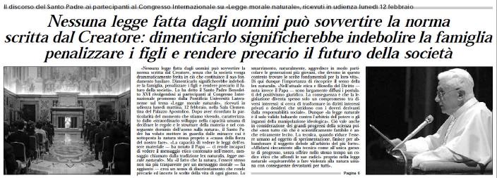 Discours du 12 février 2007, à l'occasion d'un congrès sur le thème de la loi naturelle: "Aucune loi faite par les hommes ne peut renverser la norme écrite par le Créateur, sans que la société ne soit dramatiquement blessée dans ce qui constitue son fondement même" (14/1/2014).