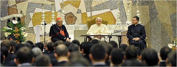 «Etre régénérés, se laisser régénérer implique donc également de se laisser insérer de manière voulue dans cette famille, de vivre pour Dieu le Père et de Dieu le Père, de vivre de la communion avec le Christ son Fils, qui me régénère par sa résurrection, comme le dit l’Épître (cf. 1 P 1, 3), vivre avec l’Église en me laissant former par l’Église selon tant de sens, selon tant de chemins, et être ouvert à mes frères, reconnaître réellement chez les autres mes frères, qui avec moi sont régénérés, transformés, renouvelés; l’un porte la responsabilité de l’autre. »
