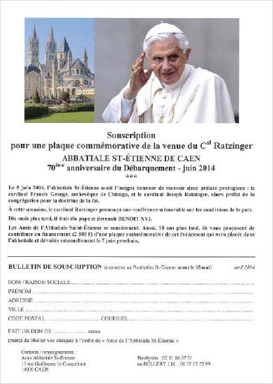 de la venue du cardinal Ratzinger à l'abbatiale Saint-Etienne de Caen le 5 juin 2004, sera dévoilée le 7 juin prochain. Transmis par Anne (22/5/2014)