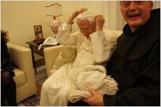 Ensuite, nous, les frères, nous avons demandé à saluer aussi le Pape Benoît. Et dans l'après-midi nous avons pu y aller. Nous connaissons très bien le commandant de la gendarmerie du Vatican Domenico Giani, qui est d'Arezzo et a toujours été très proche du sanctuaire, et chaque année, les gendarmes viennent faire quelques jours de retraite chez nous à La Verna ». (*)