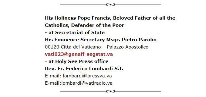 A l'initiative d'un site anglophone http://pray4thefriars.wordpress.com/ , une pétition internationale a été lancée pour demander au Pape François de recevoir les fondateurs.