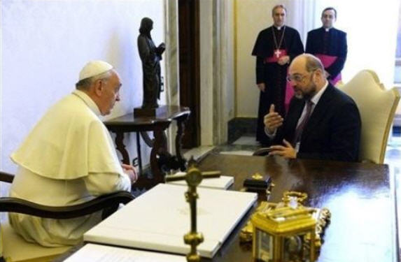 >>> Ci contre: Martin Schulz présente au pape l'invitation officielle, le 11 octobre 2014