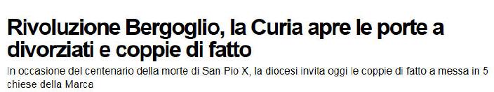 En ce jour du centenaire de la mort de saint Pie X - mort dans la nuit du 20 Août 1914 - l'Eglise de Trévise ouvre pour la première fois les bras à tous les couples, qu'ils soient mariés ou "de fait". Elle les invite à prier ensemble, sans distinction: familles chrétiennes, couples mariés, fiancés, couples mariés seulement civilement, concubins, conjoints divorcés ou séparés. Personne n'est exclu. Cinq églises du diocèse ouvriront leurs portes à la tranquillité et au silence de ce moment spécial de prière.