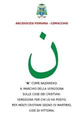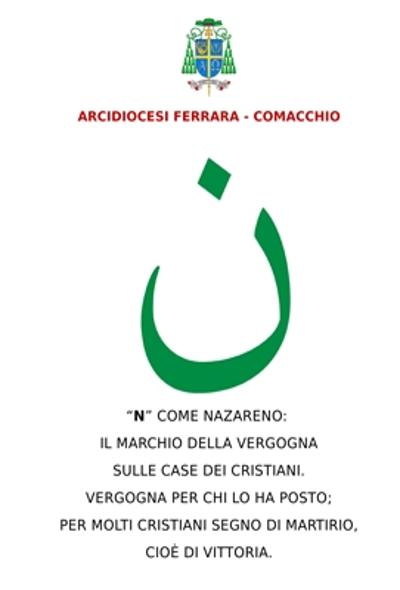 L'exposition sur la maison de votre Evêque, maison de tout notre peuple chrétien de Ferrare-Comacchio, de la marque représentant l'initiale du mot «Nassarah» (Nazaréen), le terme par lequel le Coran identifie les disciples de Jésus de Nazareth - qui a été imposée par les milices de l'autoproclamé Califat de Bagdad aux infidèles-chrétiens, pour lesquels il n'y a pas de place dans l'Etat Islamique de l'Irak à moins qu'ils se convertissent, se soumettent à un impôt spécial, subissent la dévastation de leurs lieux de culte et la confiscation de leurs biens - entend dire publiquement que l'archidiocèse de Ferrare-Comacchio se sent une seule chose avec nos frères et sœurs qui portent dans leur corps et dans leur âme les blessures de la passion et la mort du Seigneur.