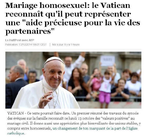 Avant le déferlement prévisible pour demain (je viens d'entendre le titre d'Europe 1: Le Vatican évolue sur l'homosexualité), voici le titre du site Huffington Post commentant le “Rapport après la discussion” (Relatio post Disceptationem) du Synode présenté par le Rapporteur général, le Cardinal Peter Erdö.