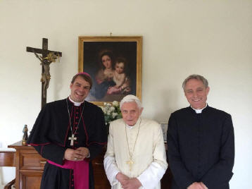 En bas Benoît XVI est avec Hubert Gschwendtner, le maire de sa ville natale de Marktl am Inn, et le curé, le Père Josef Kaiser. (http://www.pnp.de/1424960 ): tous deux sont restés 45 minutes avec leur hôte. L'occasion de la visite était le huitième anniversaire de la visite de Benoît XVI à Marktl, lors de son voyage en Bavière en 2006. Ils lui ont remis un "livre d'or" signé par les habitants, qui lui présentaient leurs voeux pour le premier anniversaire de son renoncement.