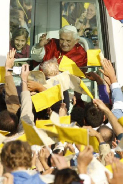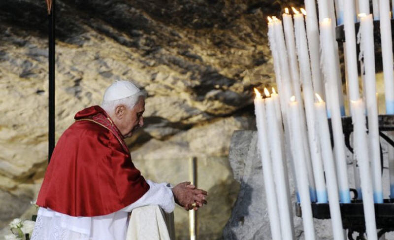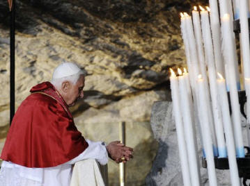 Le dimanche après-midi, l'adoration du Saint-Sacrement avec Benoît XVI rassemble plus de 200 mille personnes sur la prairie située en face de la grotte.