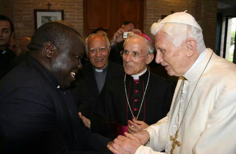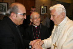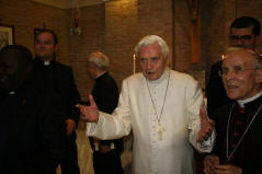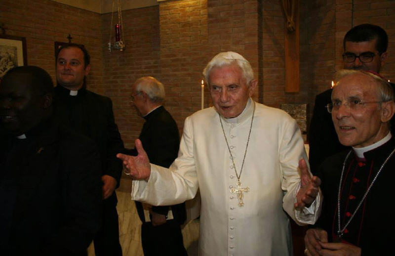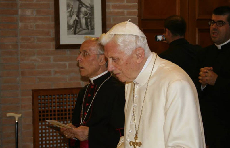 Tête à tête avec l'archevêque et un temps de prière, la canne est présente, appuyée contre le mur mais Benoît est debout sans elle. Il est très entouré et ne court aucun risque.