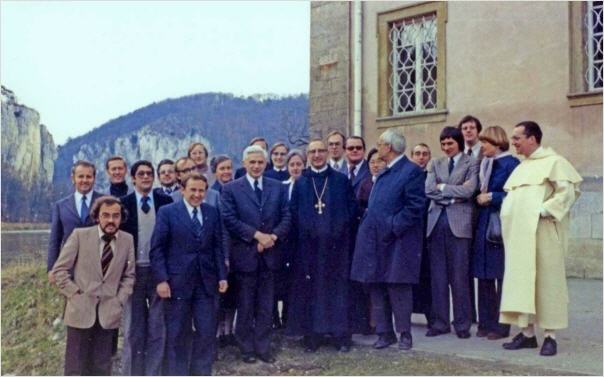 Ci-dessus: 27 février 1977, au monastère de Weltenburg (Bavière) - le prof. Ratzinger avec Karl Rahner, l'abbé et les doctorants de Ratisbonne (archive Institut Papst Benedikt, Ratisbonne)