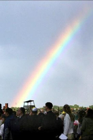 Ce fut pour moi un motif de grand réconfort de voir à ce moment-là un arc-en-ciel apparaître dans le ciel, alors que devant l'horreur de ce lieu, dans l'attitude de Job, j'invoquais Dieu, ébranlé par la frayeur de son absence apparente et, dans le même temps, soutenu par la certitude que Celui-ci, même dans son silence, ne cesse d'être et de demeurer avec nous. L'arc-en-ciel a été comme une réponse: Oui, Je suis là, et les paroles de la promesse, de l'Alliance, que j'ai prononcées après le déluge, sont valables aujourd'hui aussi (cf. Gn 9, 12-17).