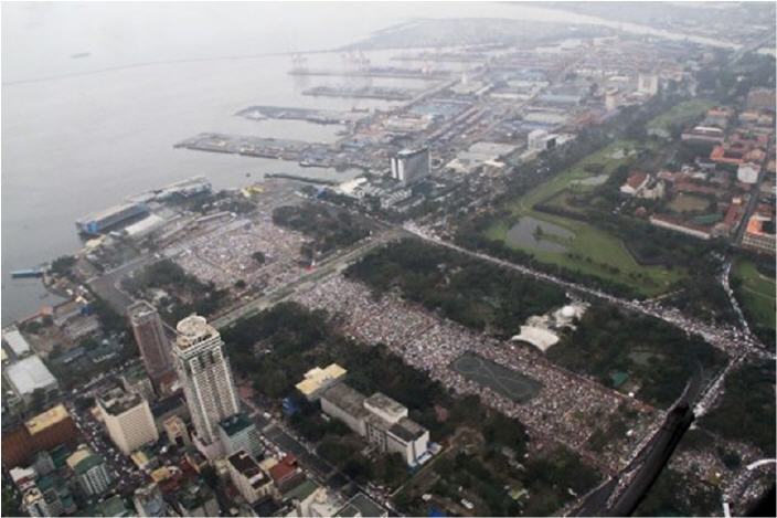 Sur la photo les étendues de vert au-delà de la zone de la messe sont les pelouses entourant l'ancienne Cité fortifiée coloniale du 16ème siècle de Manille - et à moins que les parterres n'aient été gorgés d'eau par la pluie - l'espace est un endroit plus logique pour une foule débordante que les rues secondaires qui ne donnent aucune vue sur le parc, ou le boulevard proche du parc qui longela baie de Manille, que j'ai quand même pris en compte dans l'estimation.